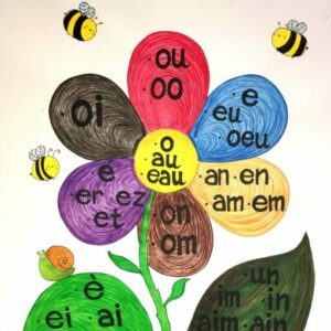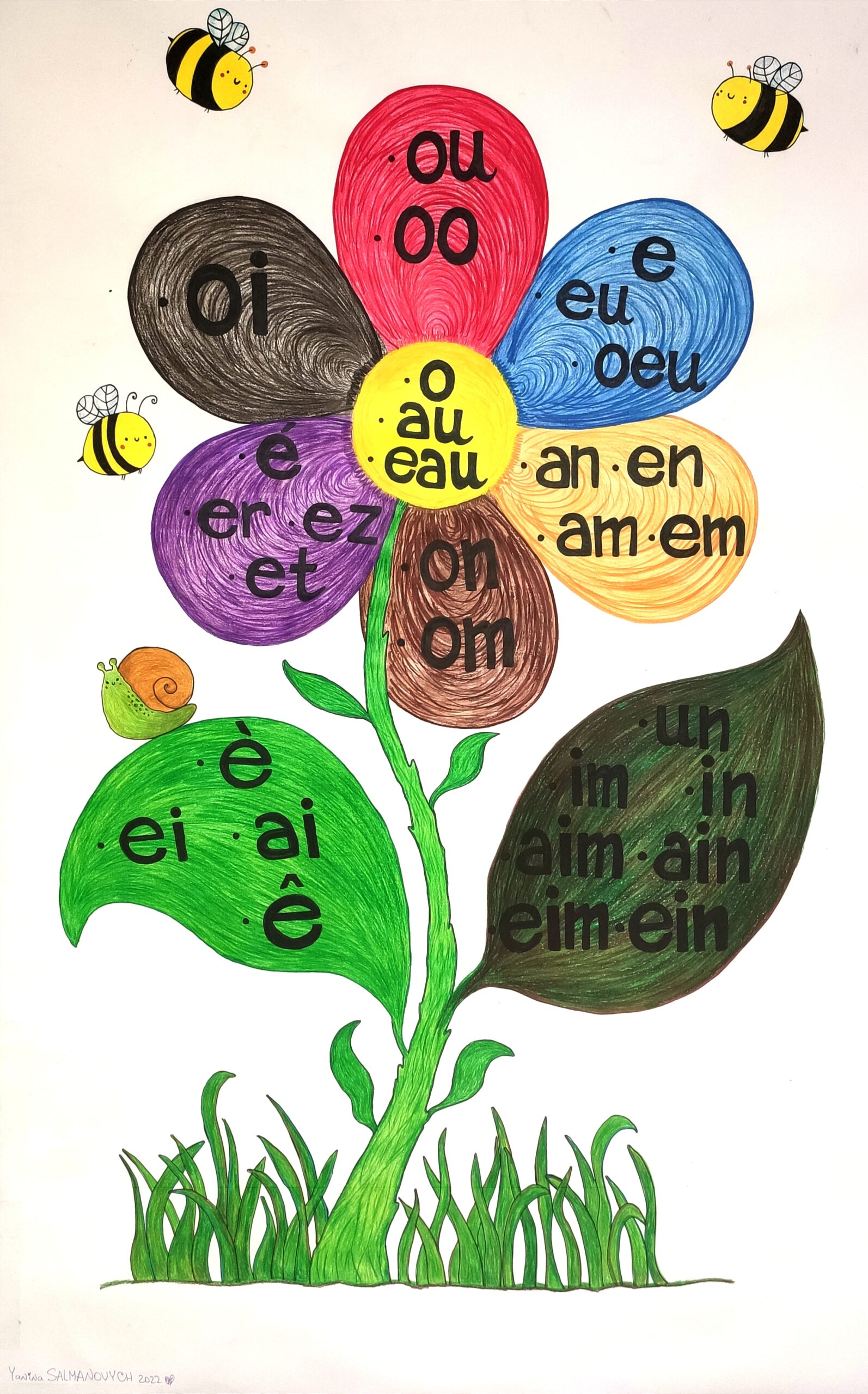 Si vous désirez un outil visuel et mnémotechnique pour travailler les sons plus difficiles, voici la fleur des sons. (ex.: OU comme rouge,…) Vous pouvez voir cette fleur dans une des salle du Sanitas, elle a été réalisée en grand par Yanina, une de nos stagiaires.